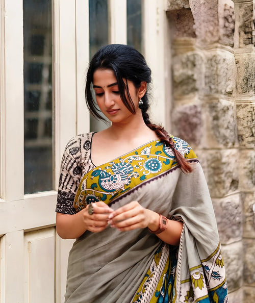 Elegant Grey Linen Saree with Kalamkari Inspired Border & Printed Blouse